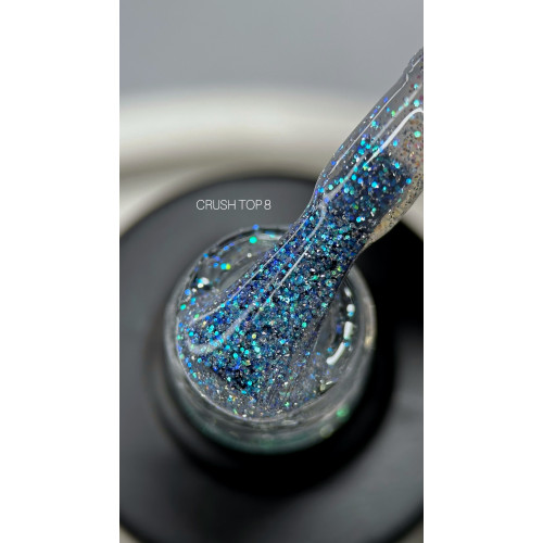 SAGA professional Top Crush to wyjątkowe topy dekoracyjne do profesjonalnego użytku w branży paznokciowej. Zawiera piasek hologramowy i cząstki odblaskowe. Ma przyjemną konsystencję i równomiernie rozprowadza się na płytce paznokcia. Efekt odbicia światła występuje, gdy sztuczne światło pada na paznokcie. W świetle dziennym lub słonecznym top nadaje manicure niesamowitego połysku. Top nie posiada lepkiej warstwy i posiada lekki filtr UV. Czas polimeryzacji 120/60 sekund UV/Led. Pojemność: 9 ml
