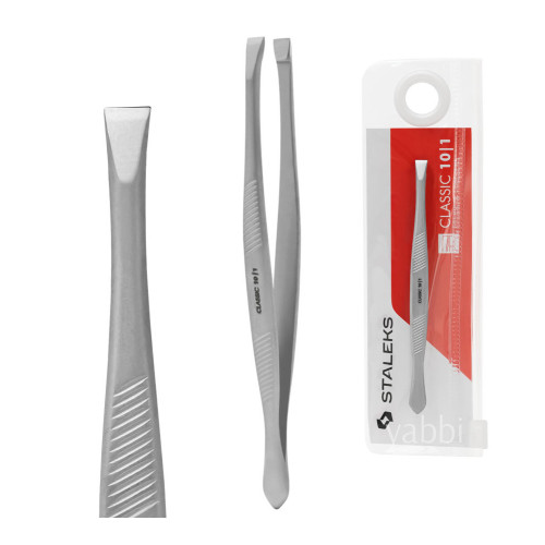 Cechy i właściwości pęsety do brwi Staleks Classic TC-10-1 wykonana ze stali nierdzewnej, używanej do produkcji narzędzi chirurgicznych, próżniowa obróbka termiczna zapewnia wysoką twardość stali, ręczne ostrzenie na ściernicy diamentowej zapewnia doskonałą precyzję, wygodne rowkowane rączki, dzięki którym pęseta nie ślizga się w dłoni, długość krawędzi roboczych 3-4mm, długość pęsety 90mm.