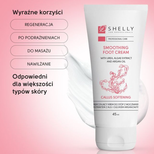 Krem Shelly pozostawia skórę miękką, jedwabistą i gładką, bez pozostawiania lepkiego osadu, dzięki czemu idealnie nadaje się do codziennej pielęgnacji lub profesjonalnego masażu stóp.