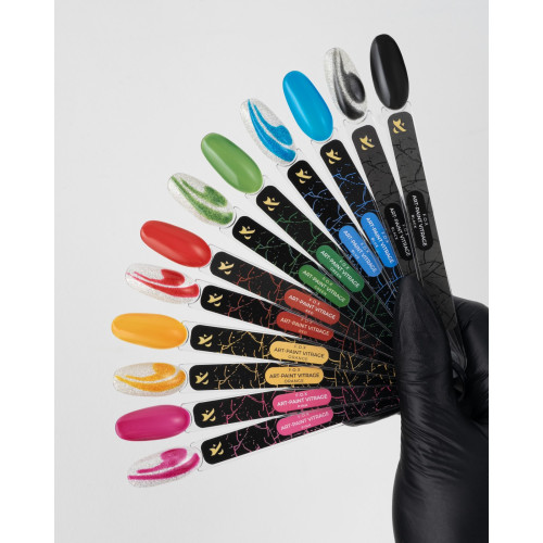 F.O.X Art-paint Vitrage — kolorowe półtransparentne farby hybrydowe 2w1 do stylizacji paznokci. Mogą być używane jako lakier hybrydowy dla pokrycia całościowego, lub dla tworzenia wzorów i malowania, o ile utrzymują linie i zachowują przezroczystość.